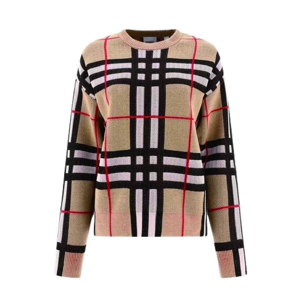 Burberryを象徴したベージュのタータンチェック柄のコットンブレンドニットクルーネックセーター。