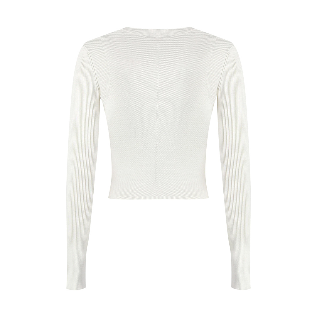 クルーネックの長袖クロップスタイルトップ。フロントのロゴとシルバー仕上げが特徴です。