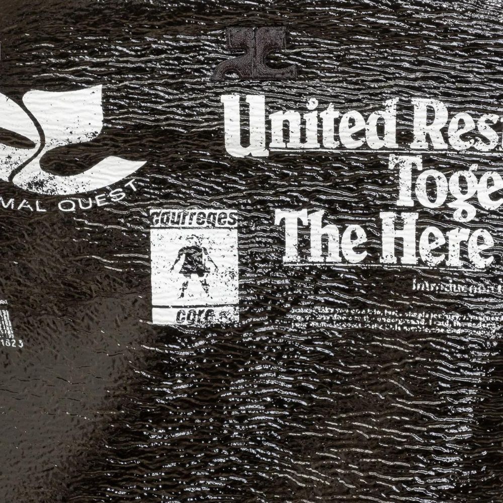調節可能なストラップと目を引くフロントロゴプリントが特徴のレジスタンス ビニール ミニ スリップ ドレス。