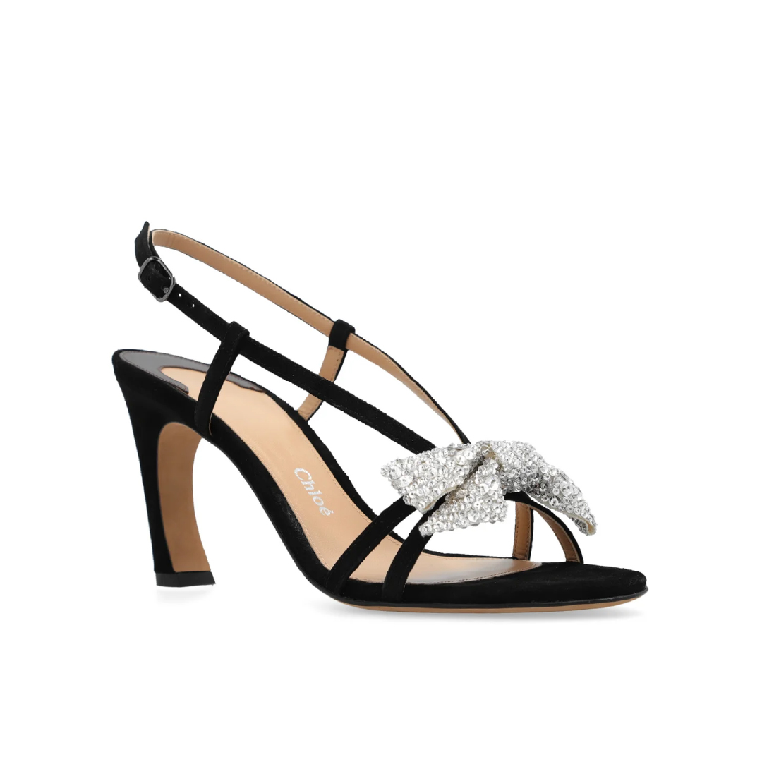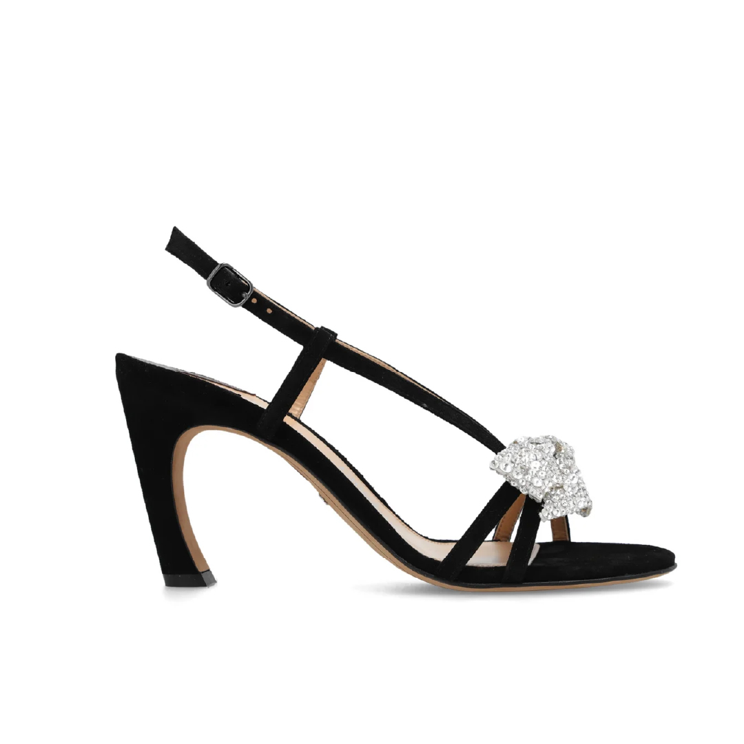 スエード ゴートスキンを使用し、ストラップのアッパーに手刺繍された特大のクリスタルのリボンが目を惹く Oli ヒール サンダル。