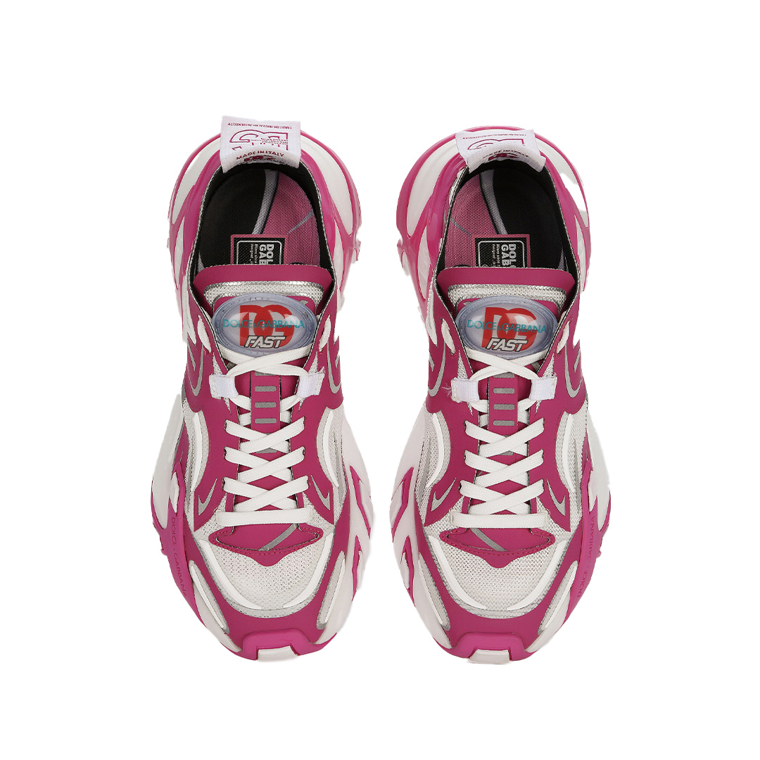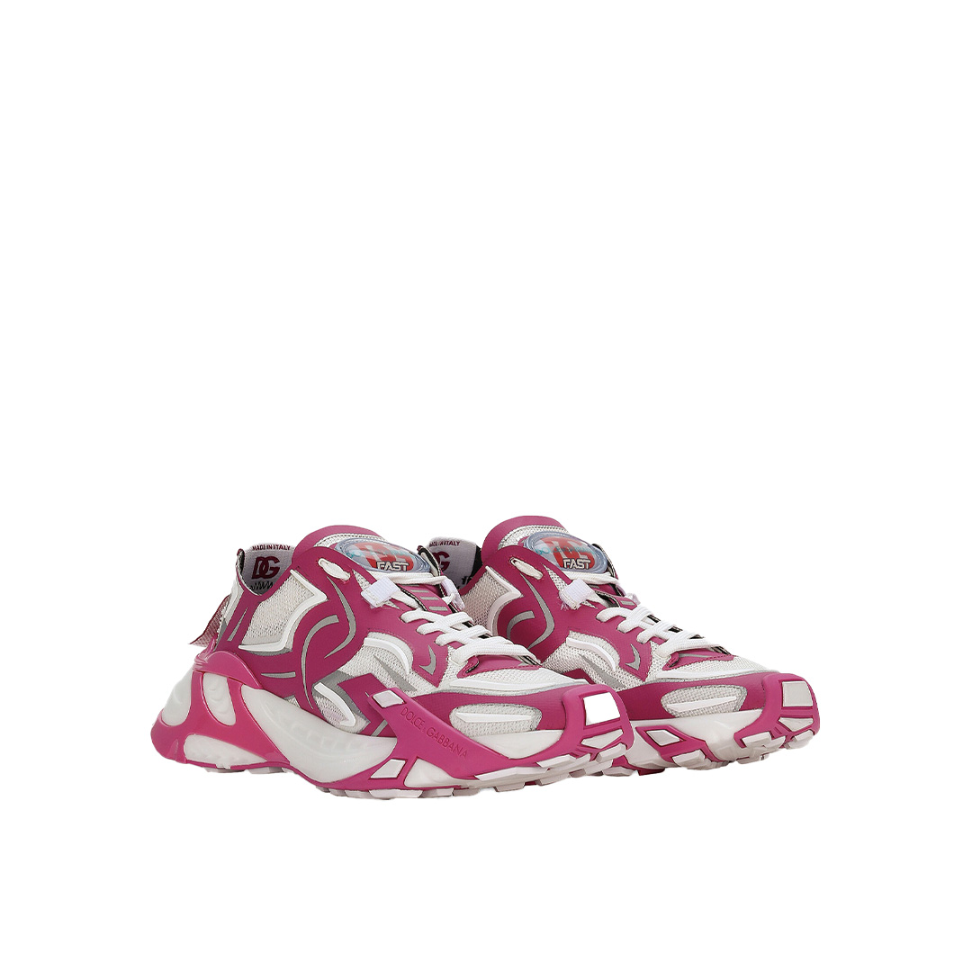 超軽量ソールを誇るこのファストスニーカーは、シルエットを際立たせるピンクとホワイトのコントラストが特徴です。