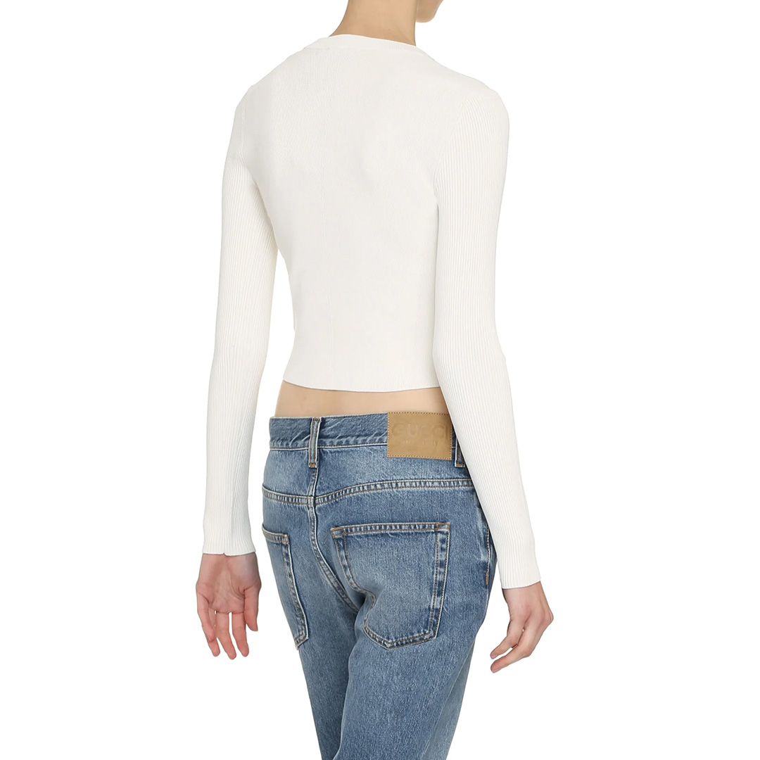 クルーネックの長袖クロップスタイルトップ。フロントのロゴとシルバー仕上げが特徴です。