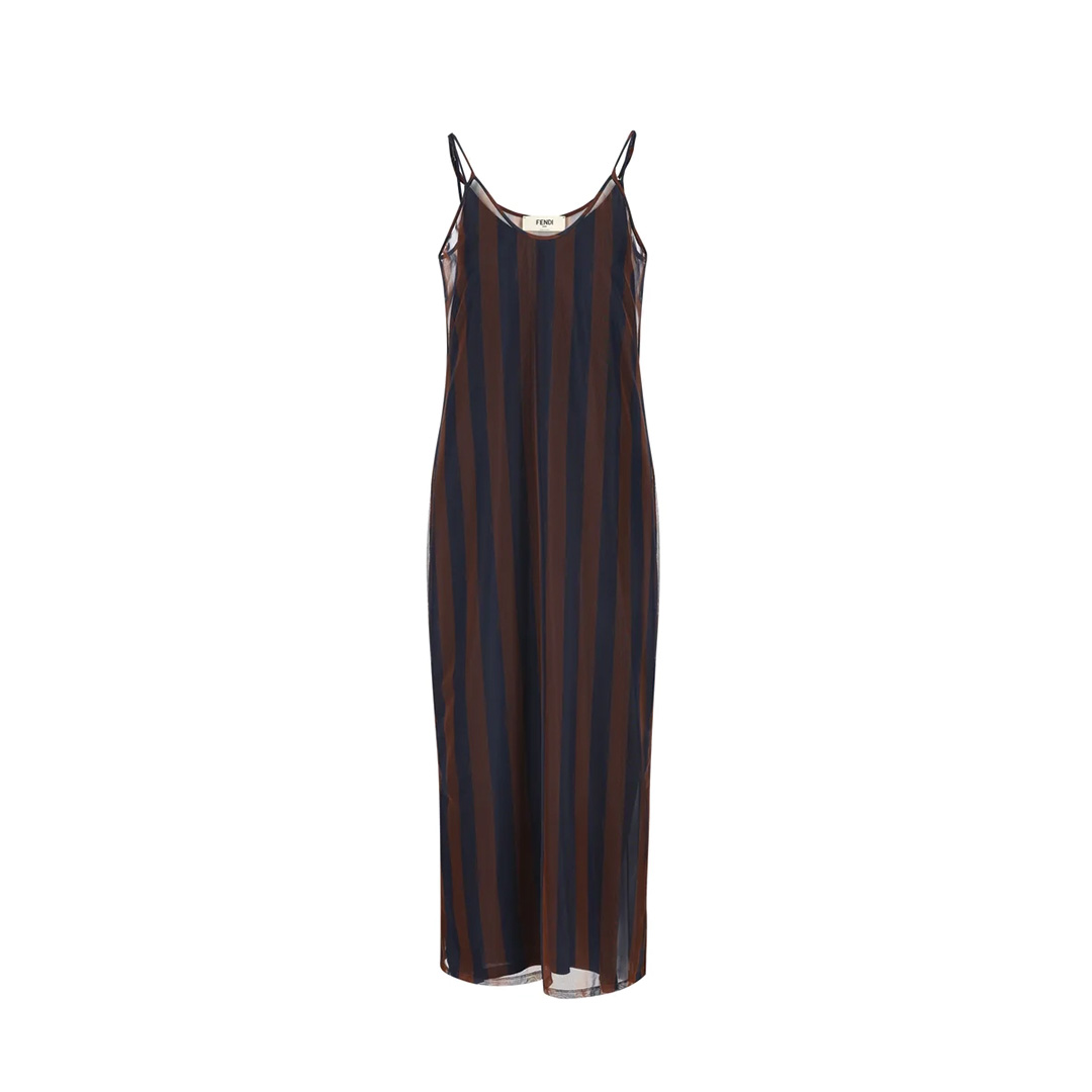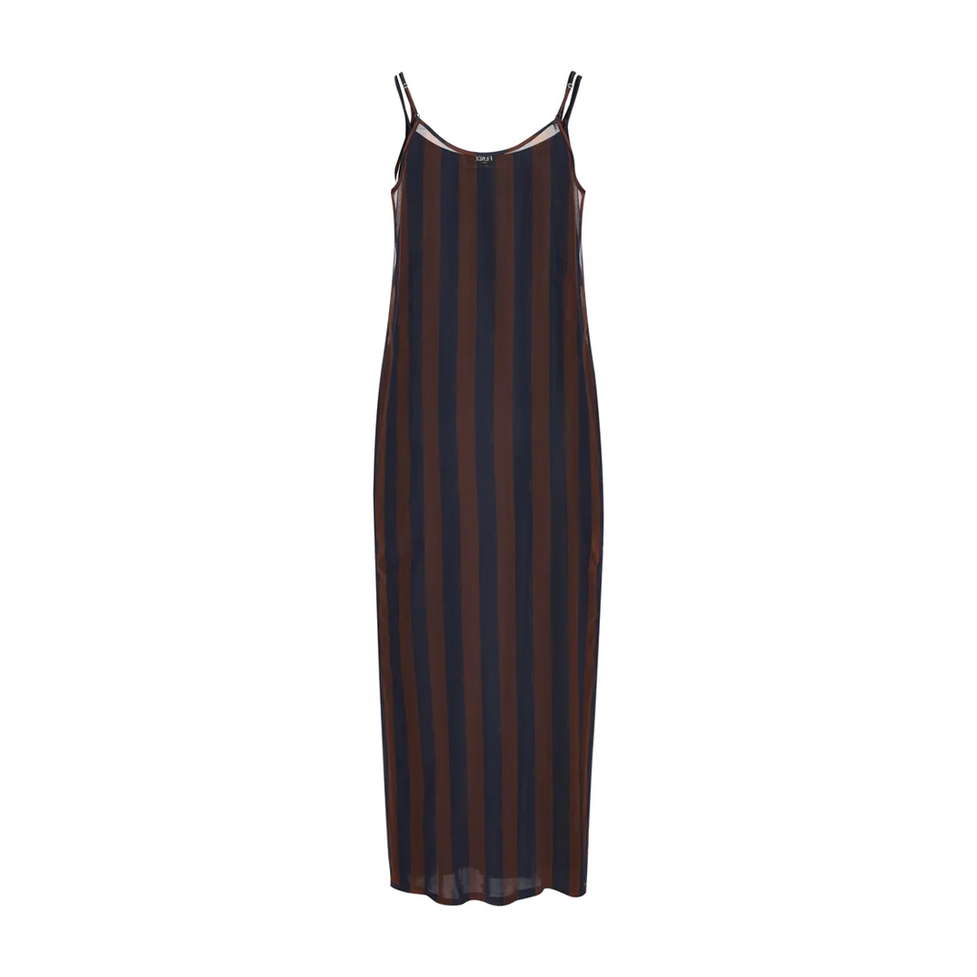 細めのショルダーストラップと裾に深いスリットが入った、ゆったりとしたロング丈のノースリーブドレス。
