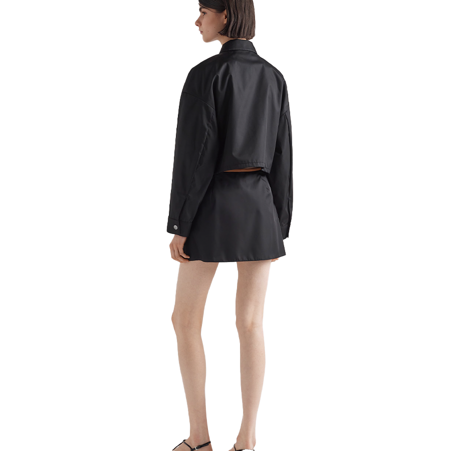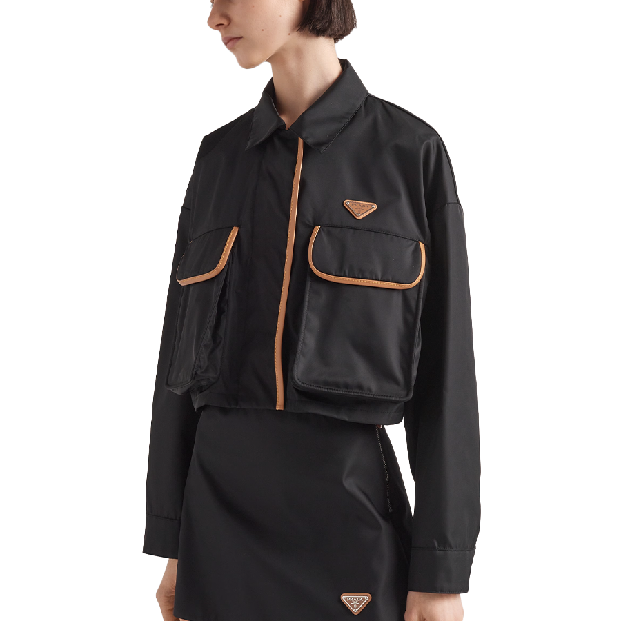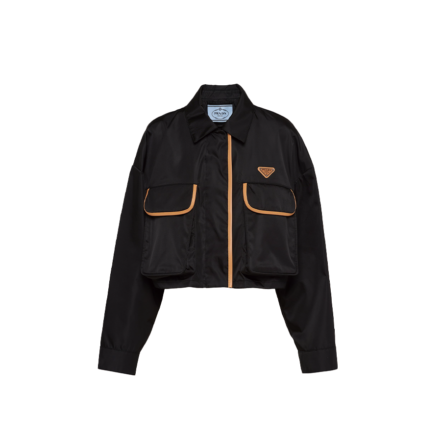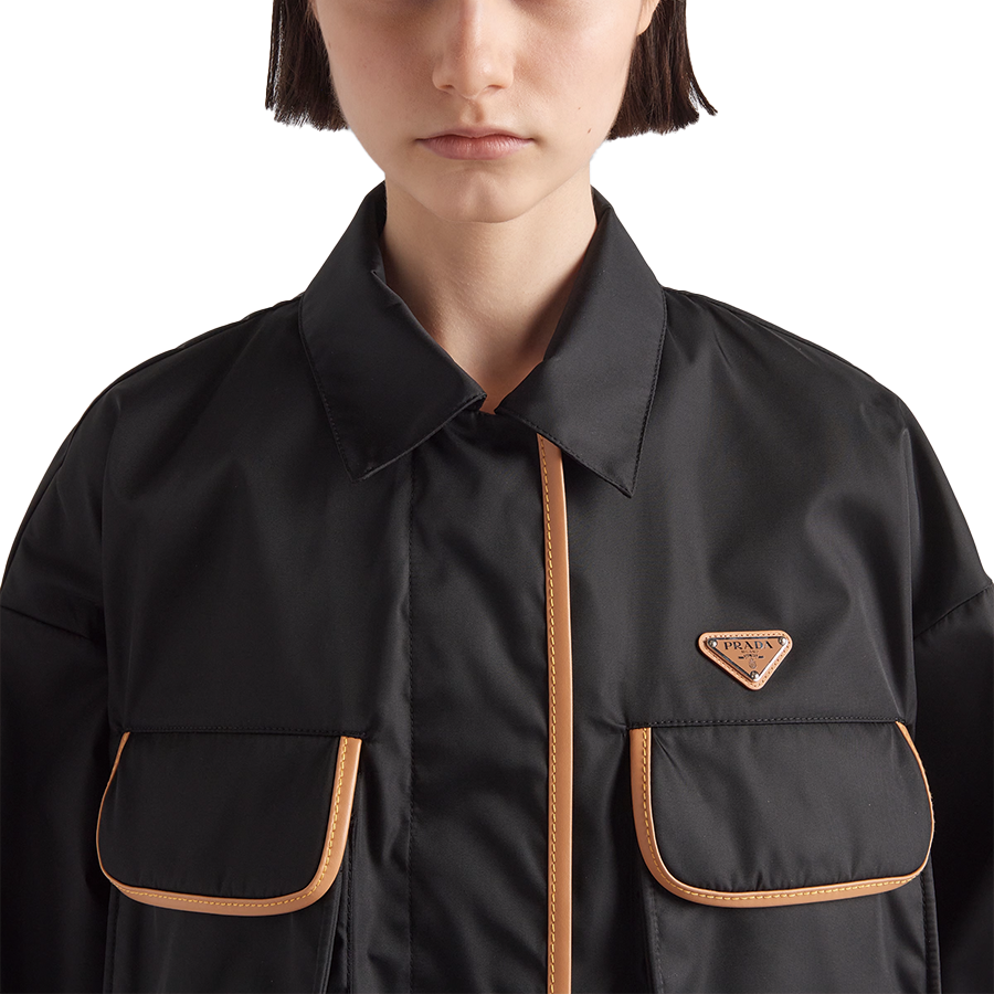 革新的な再生ナイロン生地が、シャツ スタイルの襟が付いたボックス型のシルエットにモダンな雰囲気を添え、エレガントなレザー トリムで縁取られたユーティリティ ポケットで装飾されています。レザー ベースにエナメル加工を施した金属製の三角形のロゴが、アイコニックな印象を与えます。