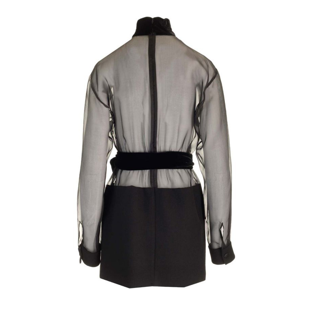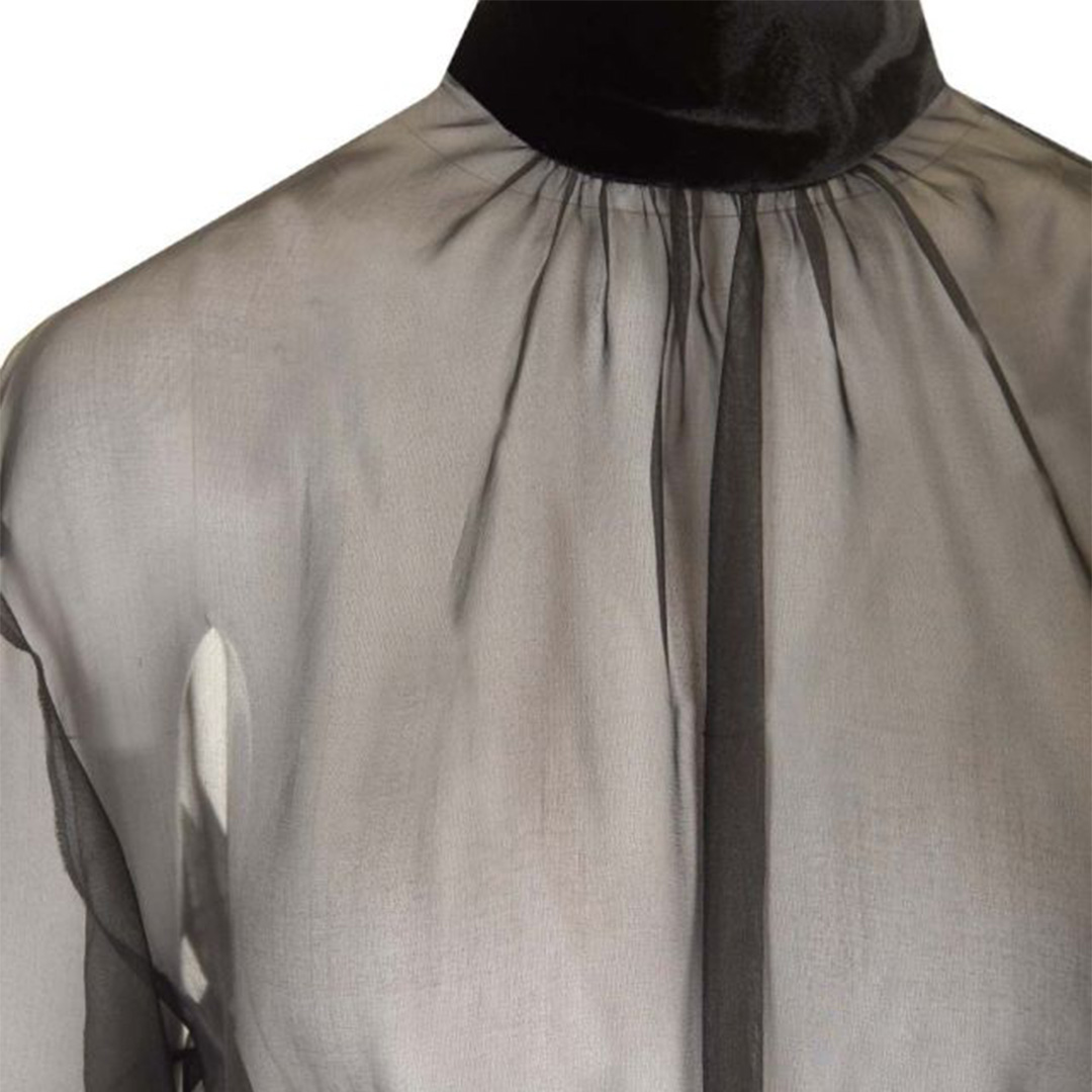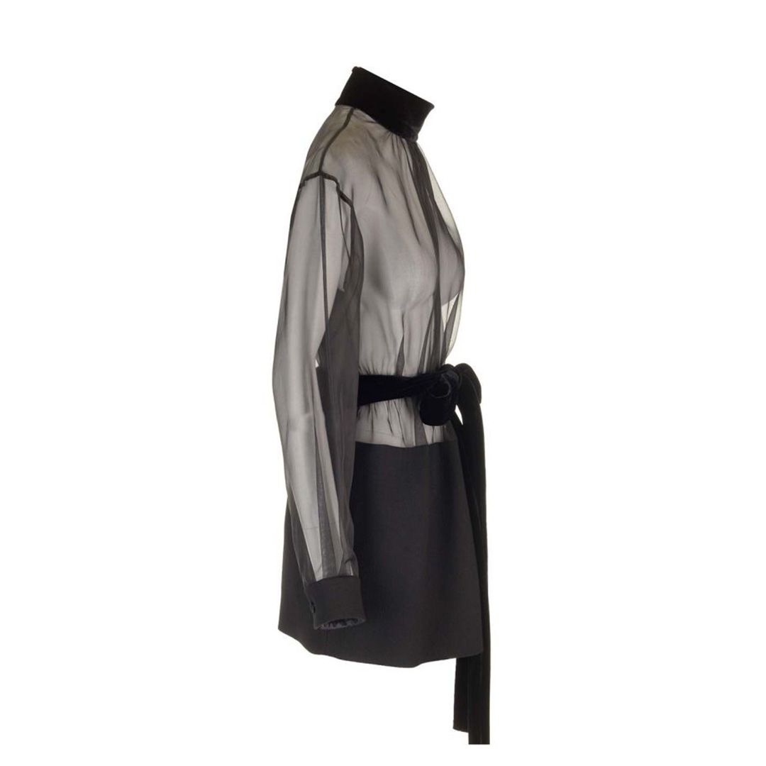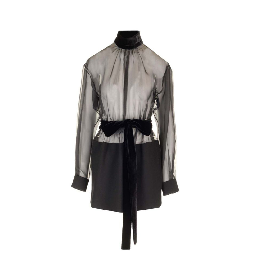 透け感のある薄手の生地で上品さと繊細さを兼ね備えたミニドレス。ベルベットの高めの襟とエレガントに結ばれたベルトがウエストラインを美しく見せてくれます。特別な日に大胆でエレガンスな装いを。