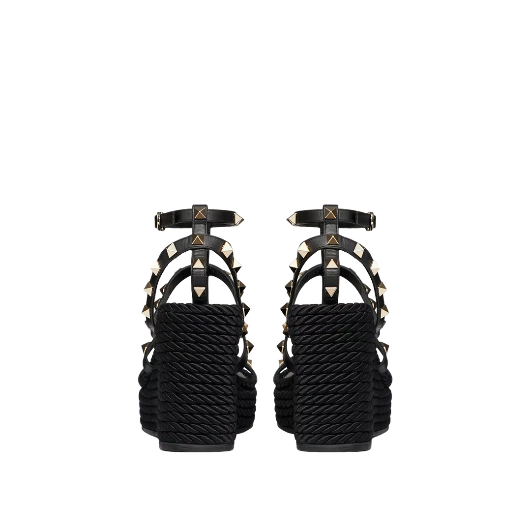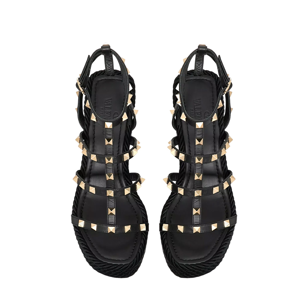 ブラックレザーとウェッジソールに、アイコニックなゴールドのスタッズが映える、洗練されたデザインです。アンクルストラップが足首をしっかりとホールドし、安定感とスタイルを両立しています。