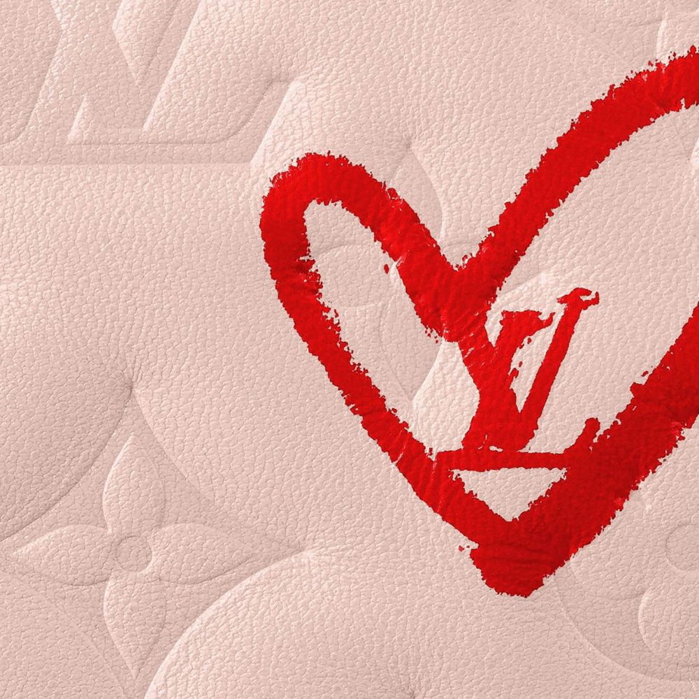 ニコラ・ジェスキエールの「フォール イン ラブ」カプセル コレクションの一部として、バッグの右上に赤い口紅で手で描かれたように見える小さな赤いハートが特徴。