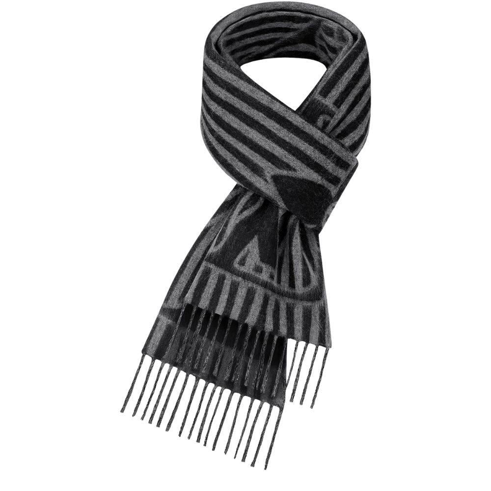 特大の LV イニシャルとクラシックなダミエ パターンをストライプと融合させたLV グラフィカル スカーフ。