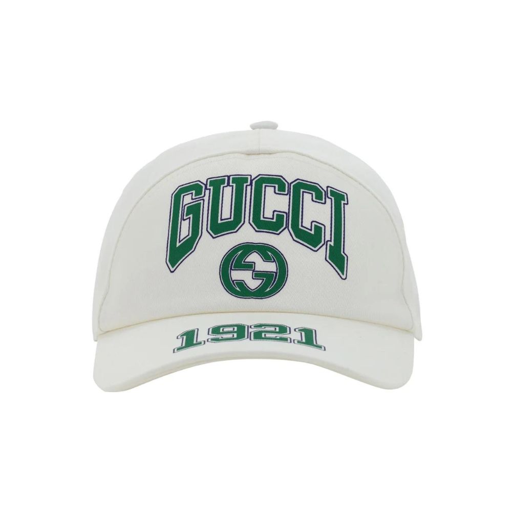 【GUCCI】ホワイトのコットン地にGUCCIインターロッキングG1921プリントをあしらったベースボールキャップ。