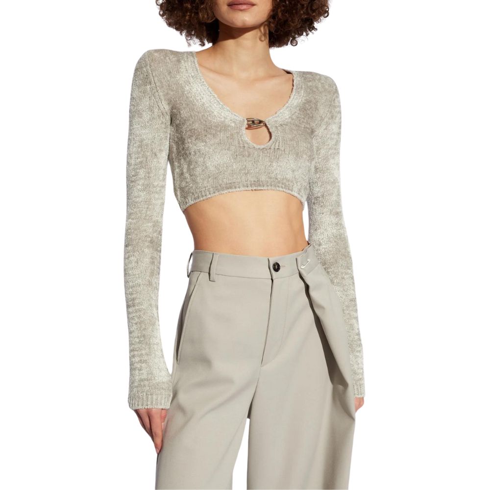 ディーゼルを象徴するオーバルDのメタルプラークのワンポイントが入った、高品質のビスコースシェニール糸をブレンドしたスリムフィットのクロップドトップ。