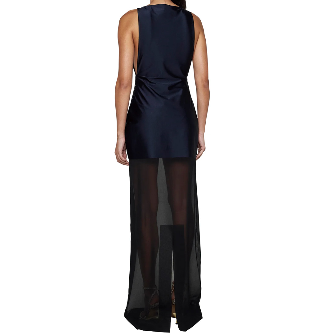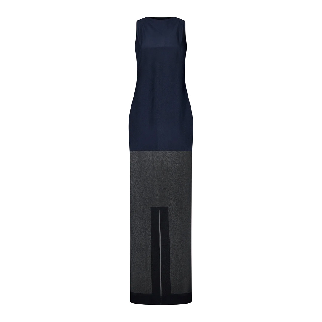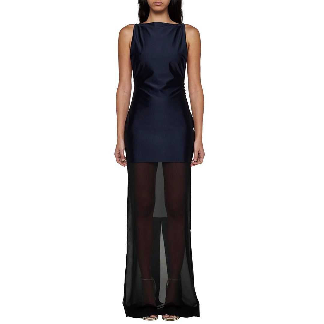 ブラックのムースリーヌ生地を使用したブルーのストレッチ ジャージー ドレス。