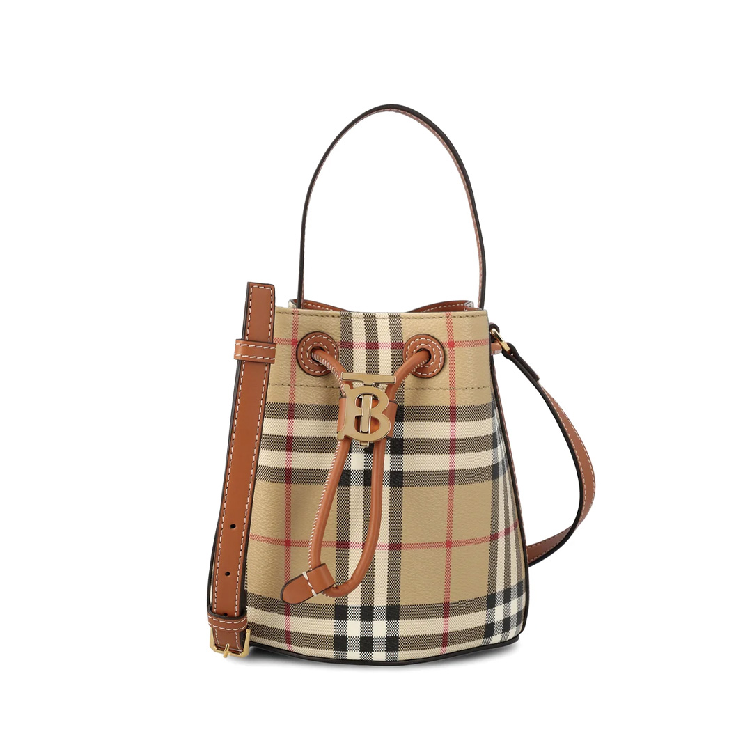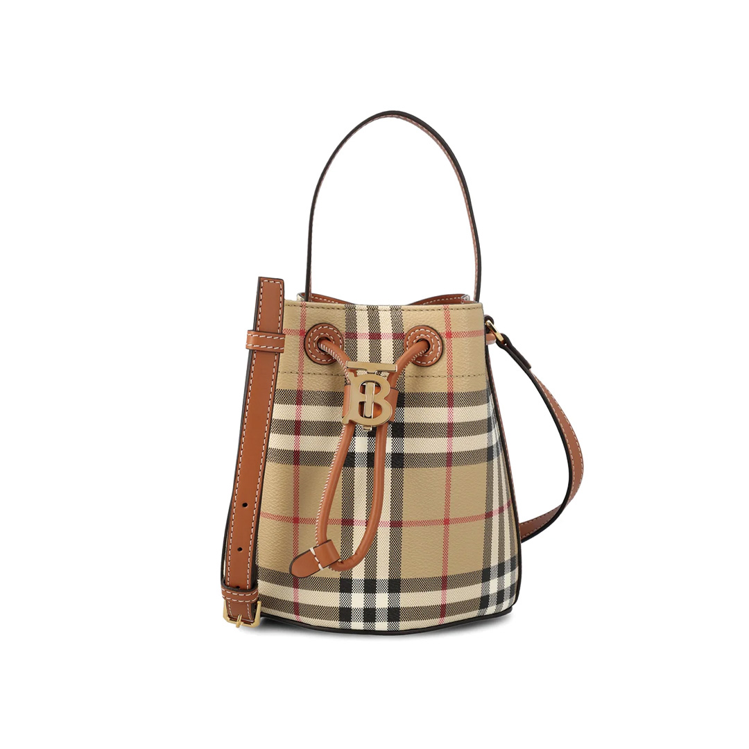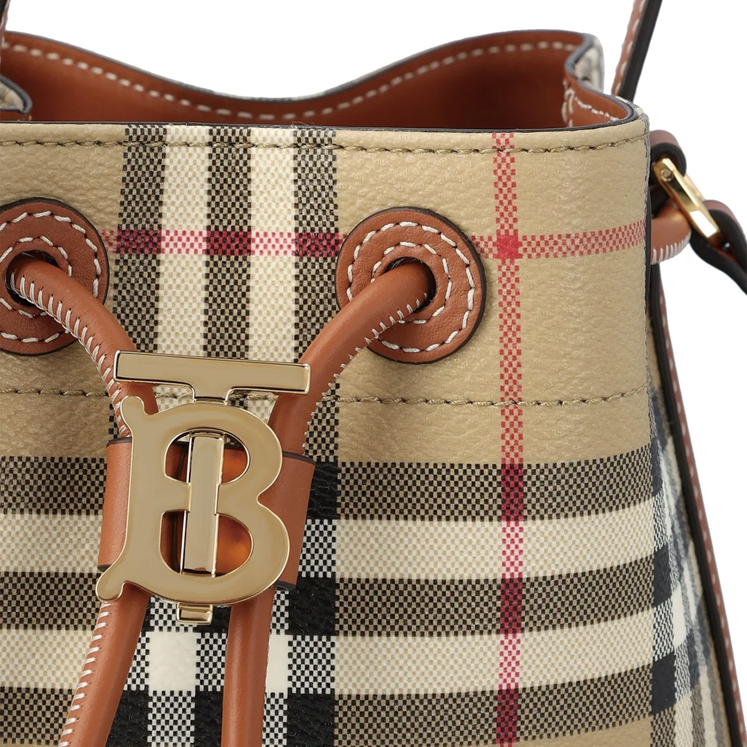 バッグ全体にブランドを代表するチェック柄が施されたバケットバッグ。