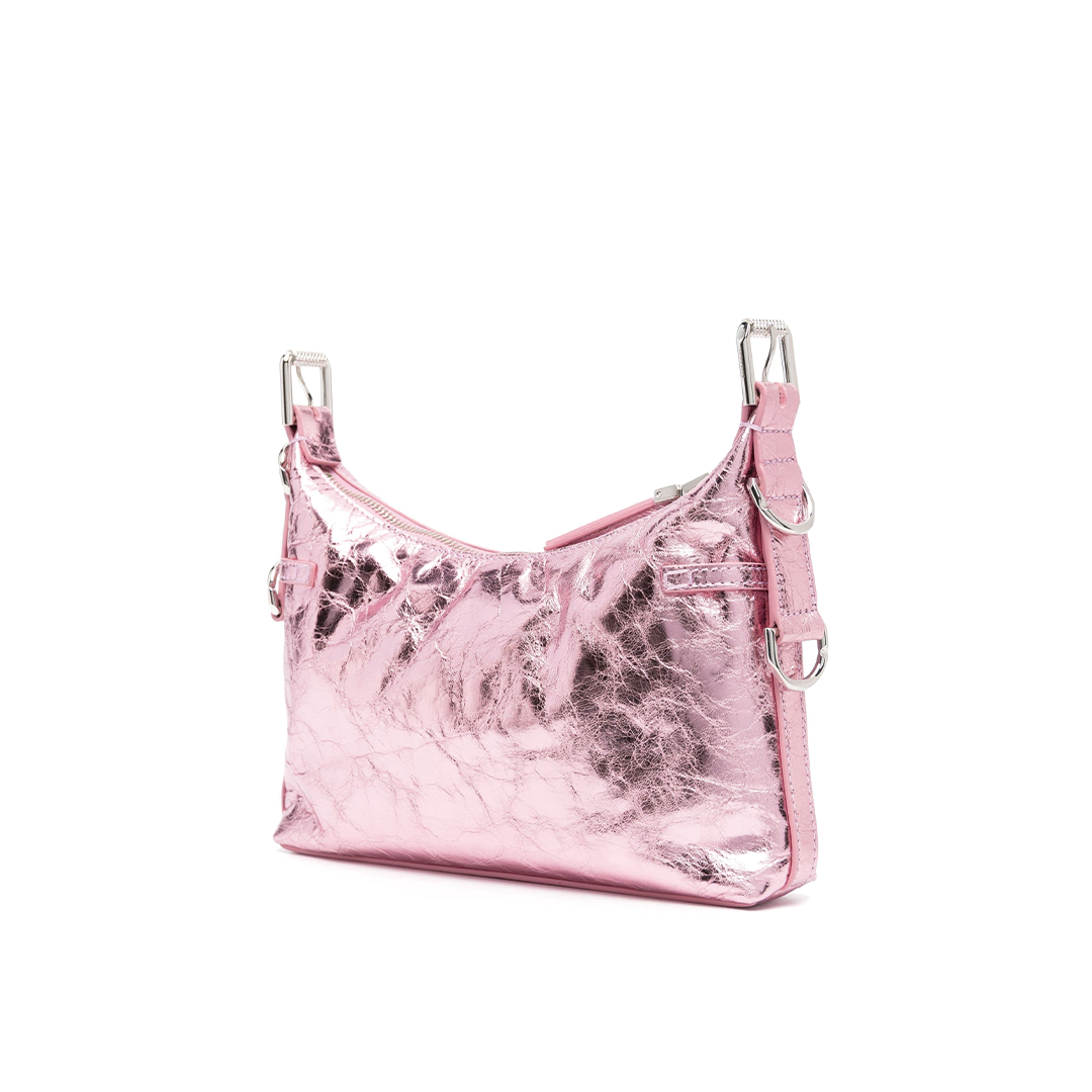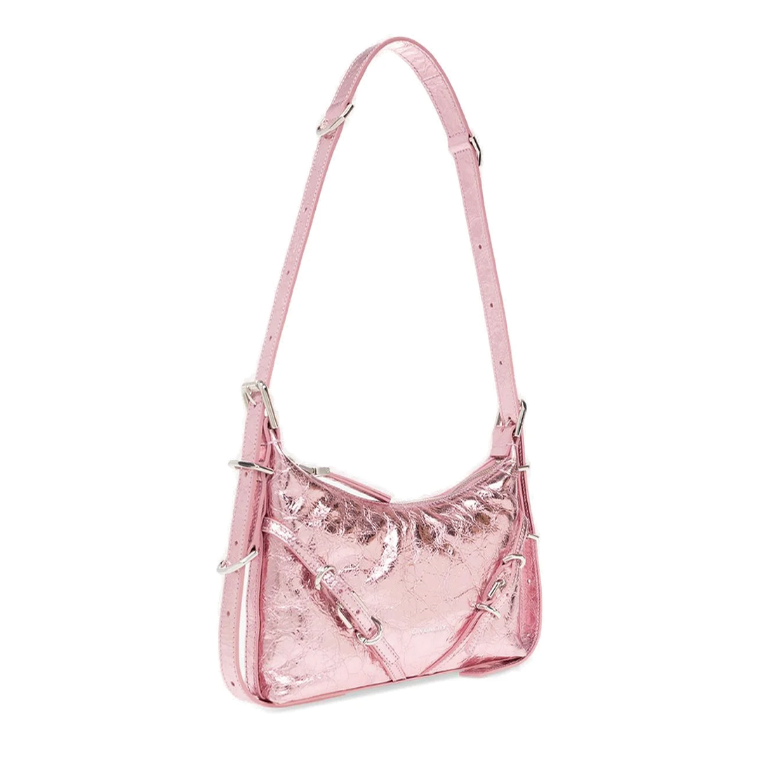 ジバンシィらしいモード感あふれる、メタリックピンクのショルダーバッグです。独特のシルエットと光沢感のあるレザーが個性を際立たせ、どんなコーディネートにも華やかさをプラスします。