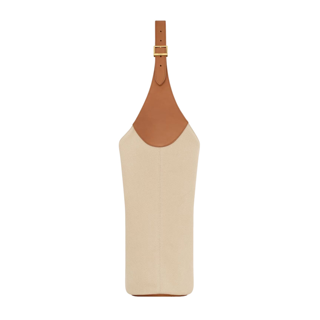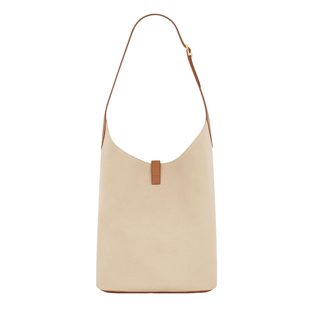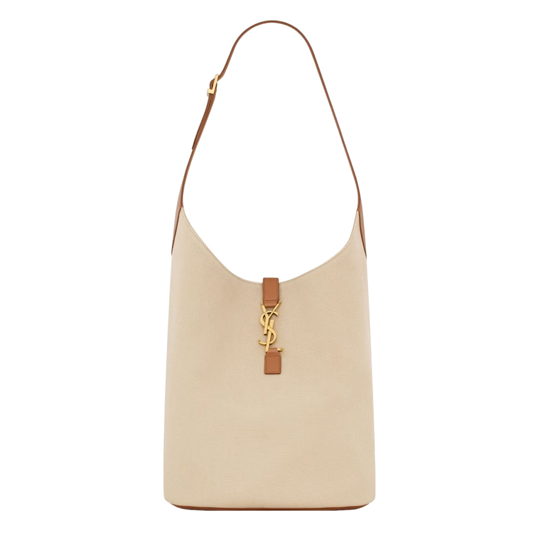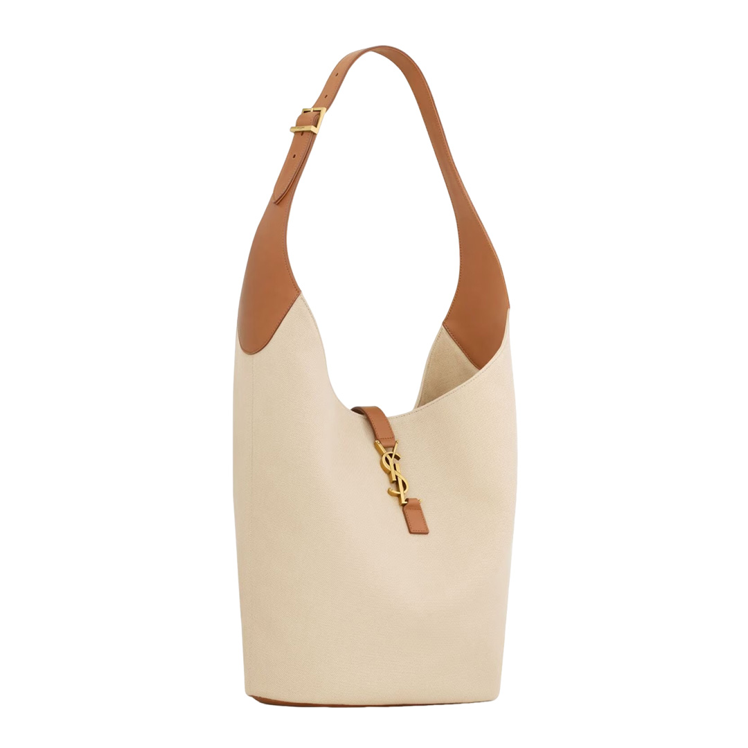 アイコニックなLE 5 À 7のホーボーバケットモデル。ベジタブルタンニンレザーを使用しています。YSLモノグラムがあしらわれたレザーのタブクロージャーが印象的です。