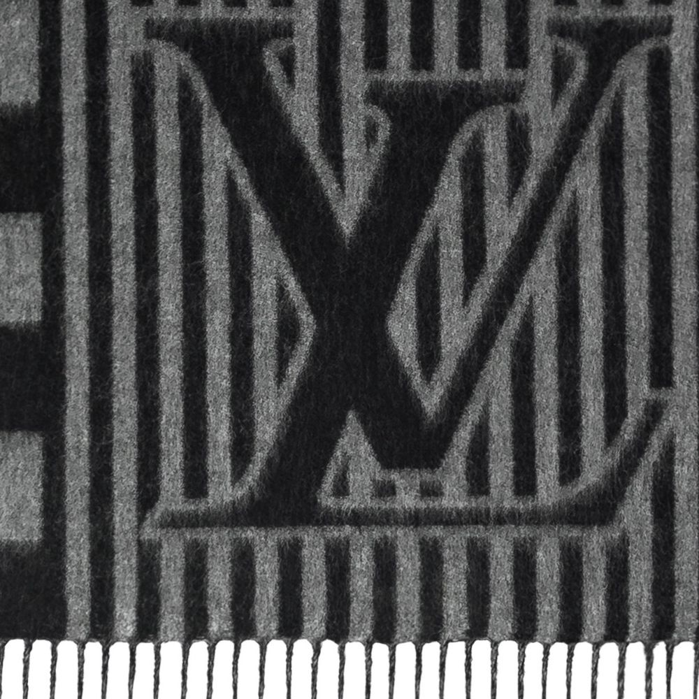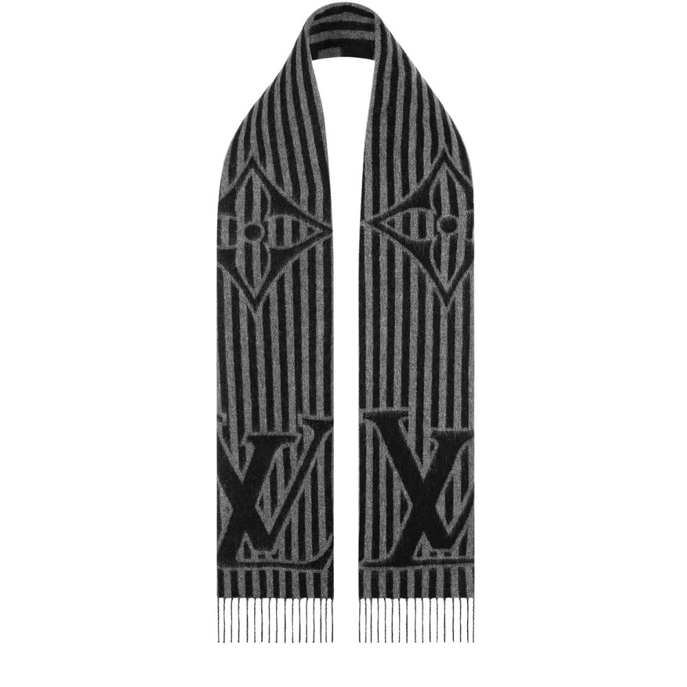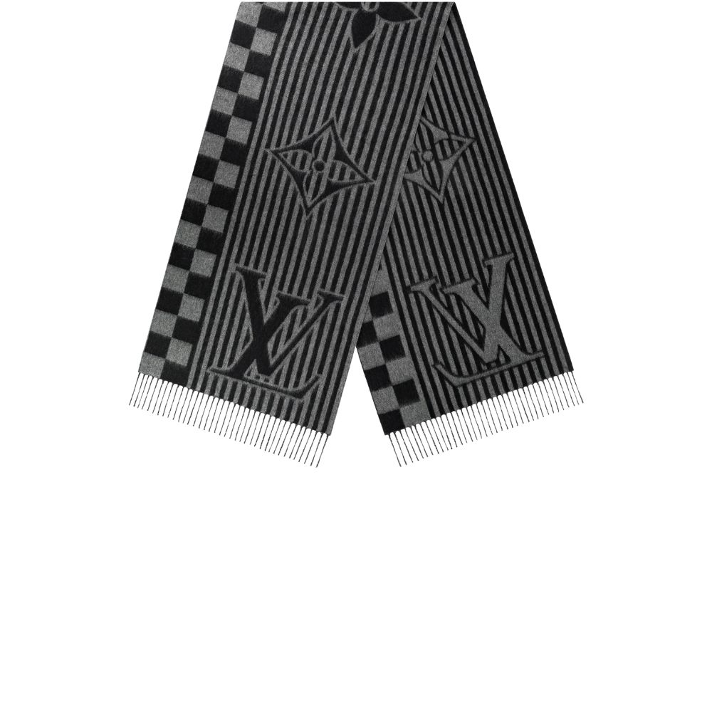特大の LV イニシャルとクラシックなダミエ パターンをストライプと融合させたLV グラフィカル スカーフ。